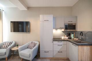Jedinice uključuju parketne podove, potpuno opremljenu kuhinju s perilicom posuđa, blagovaonicu, TV ravnog ekrana sa satelitskim programima te vlastitu kupaonicu s tušem i sušilom za kosu. Gosti se mogu koristiti hladnjakom, pločom za kuhanje, tosterom i električnim kuhalom za vodu.