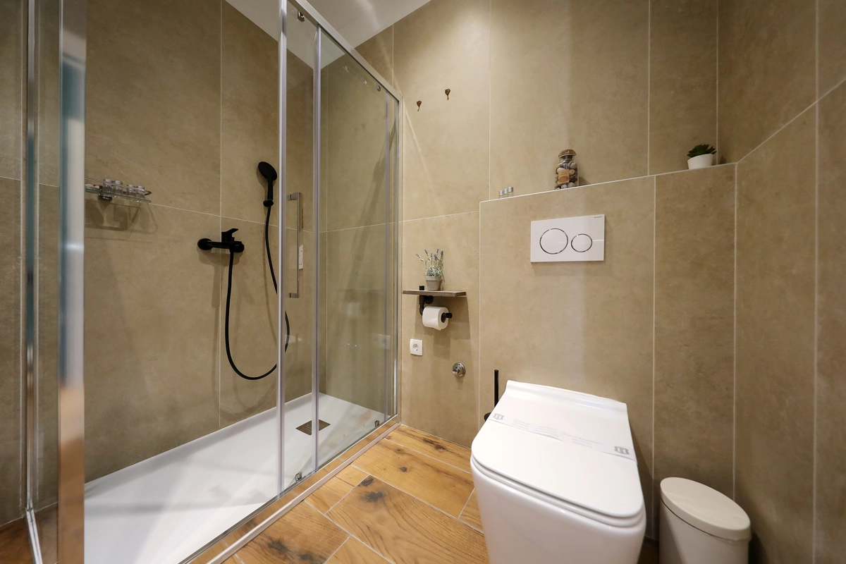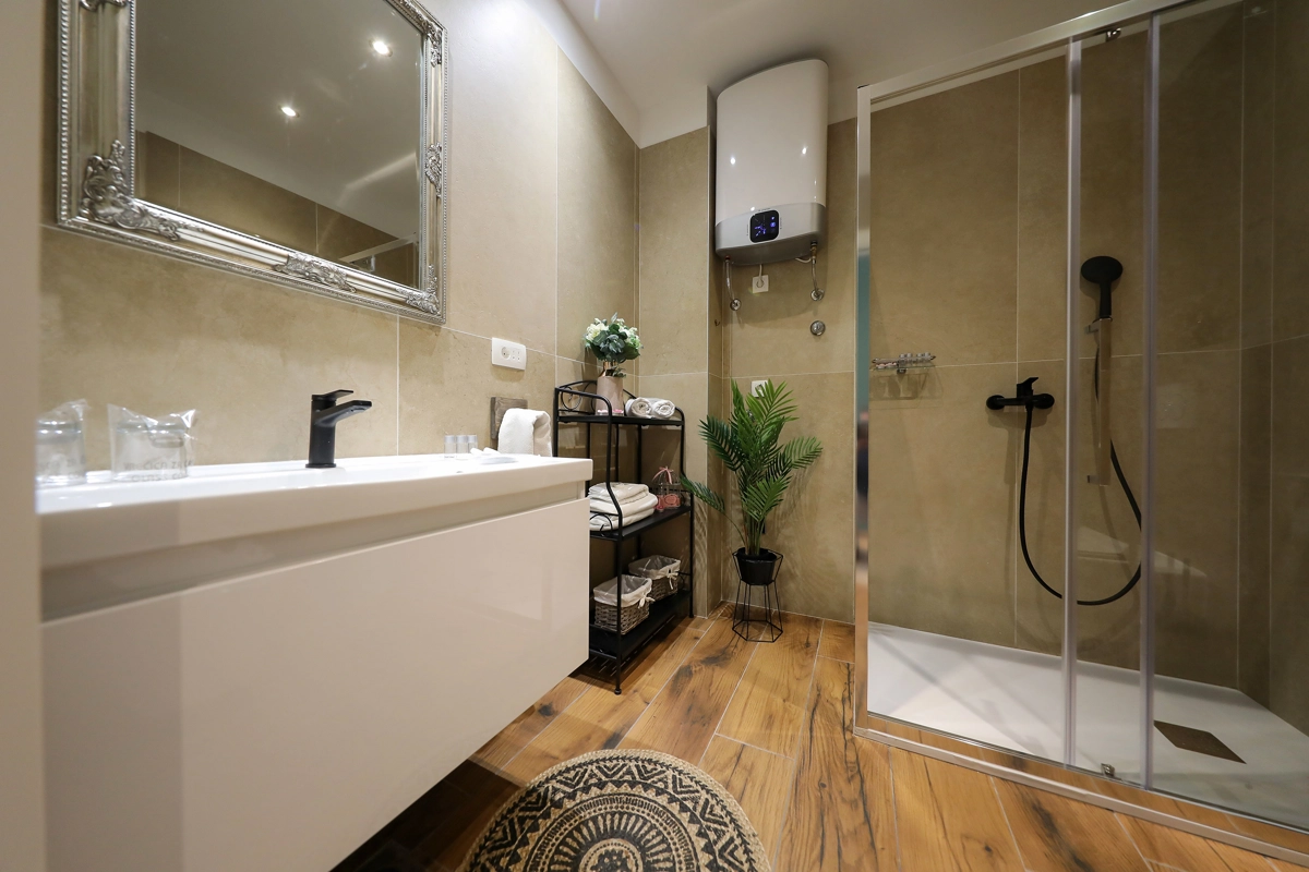 Apartments have a fully equipped kitchen and bathroom while rooms have a bathroom with a shower.