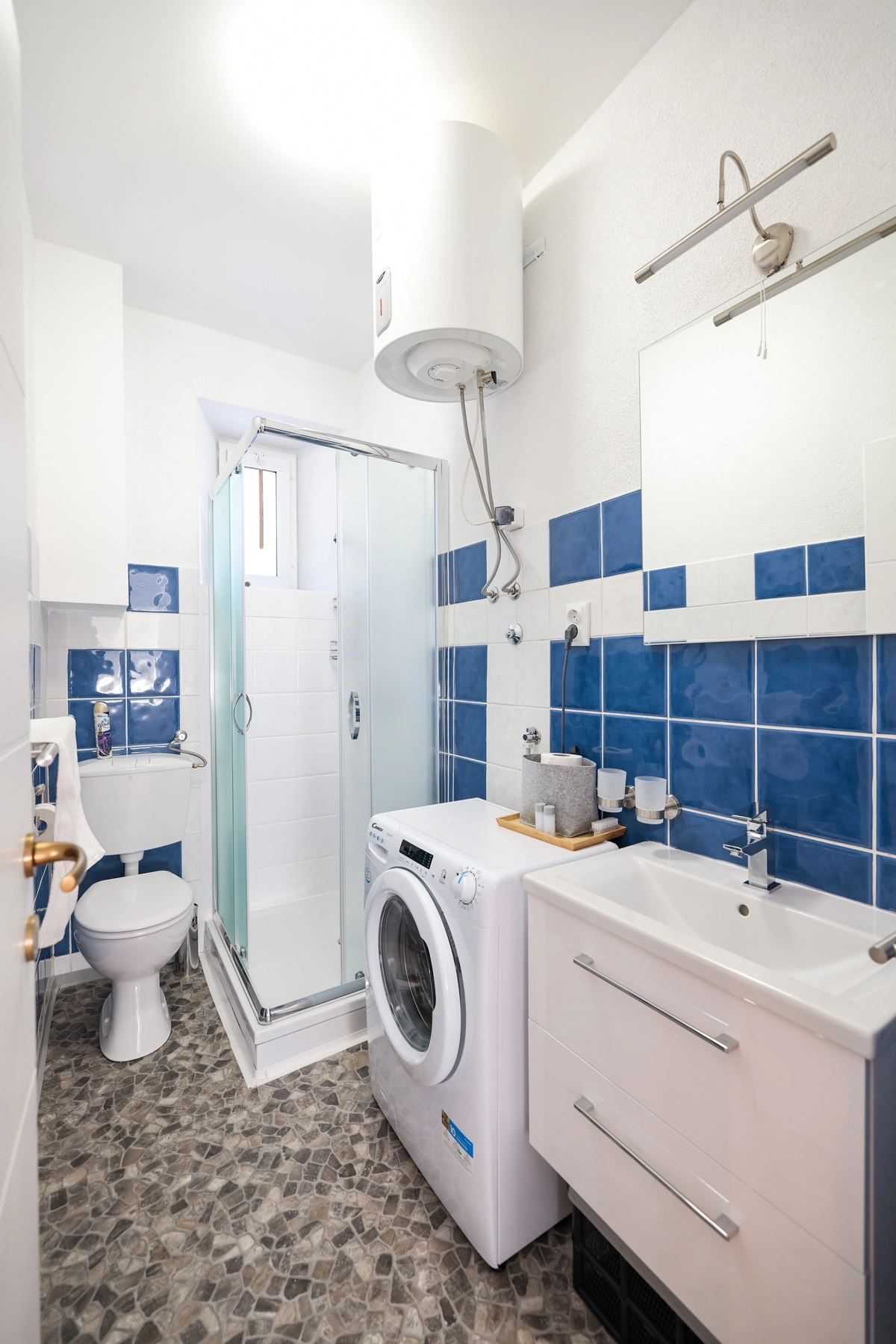 Our charming and brand-new, air-conditioned apartment consists of 1 bedroom (box spring bed 160cmx200cm), a living room with a dining table and 4 chairs, a fully equipped kitchen with a dishwasher, a Nespresso coffee machine, a microwave and a kettle. The bathroom has a shower, washing machine and hairdryer. There is a flat-screen TV and free WiFi.