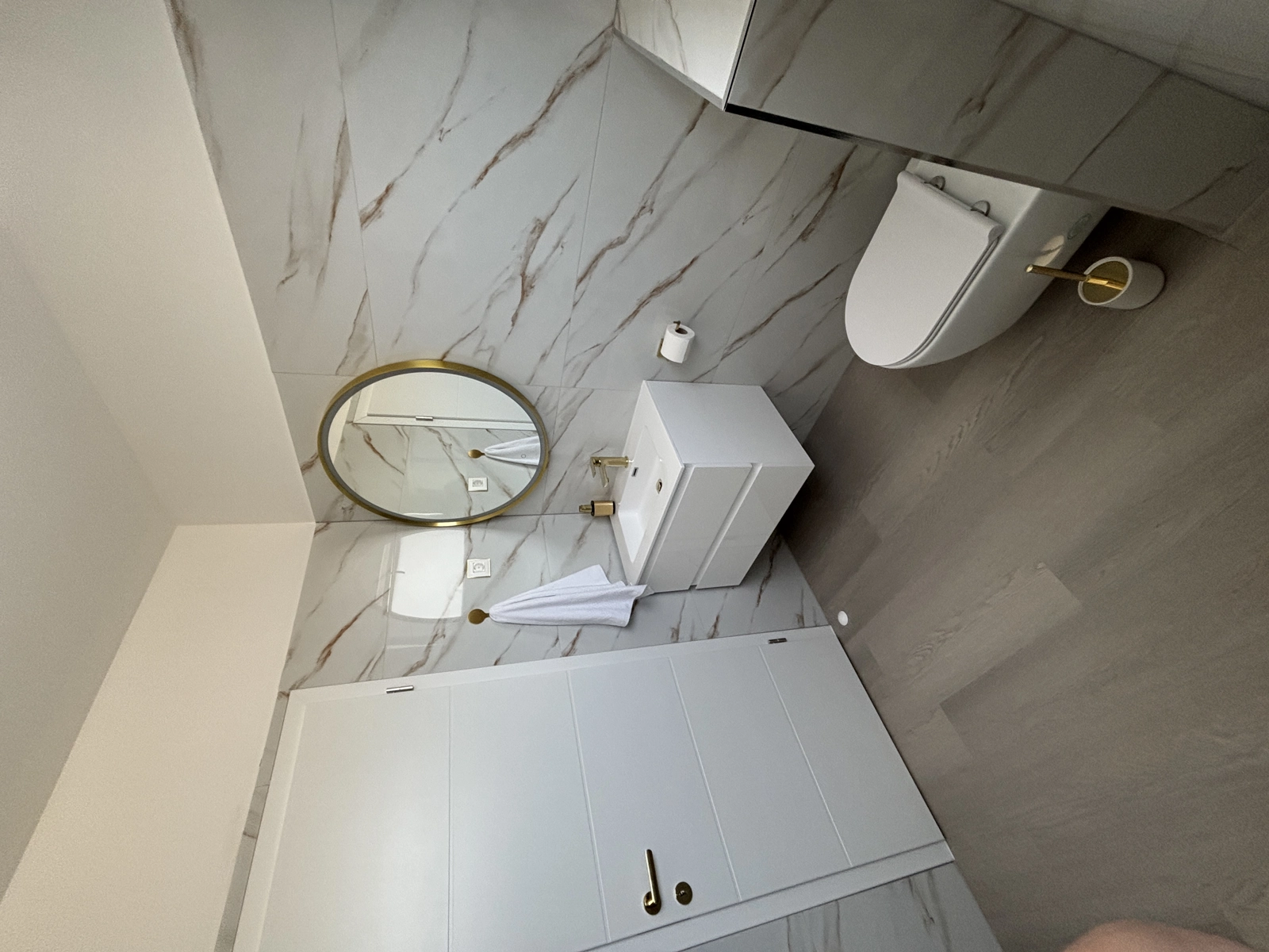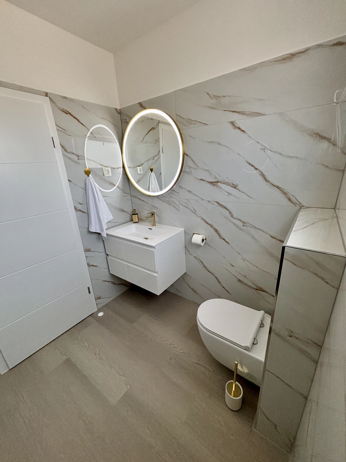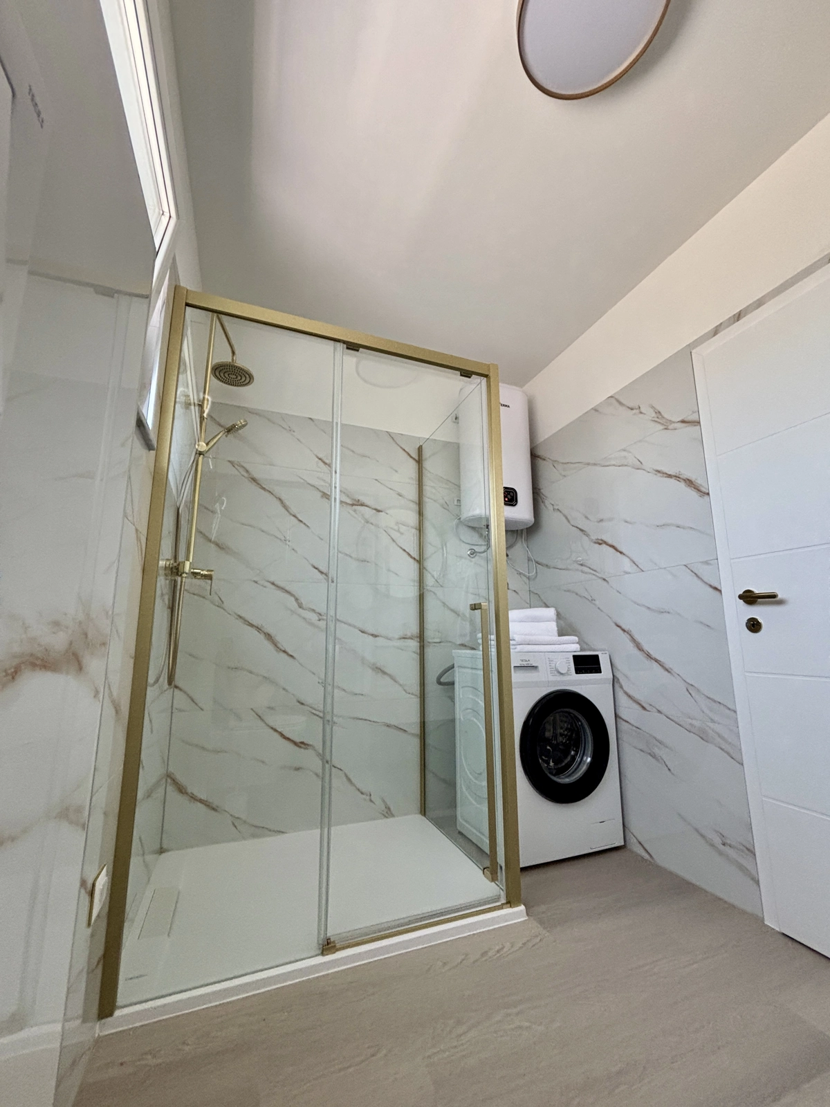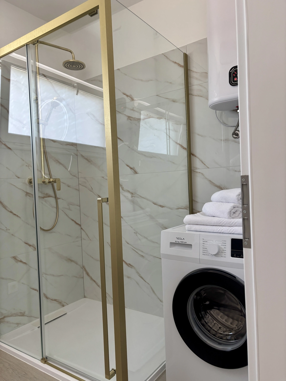 Enjoy a refreshing shower in our elegant bathrooms, featuring gold-finished fixtures, high-quality tiling, and a washing machine for your convenience.