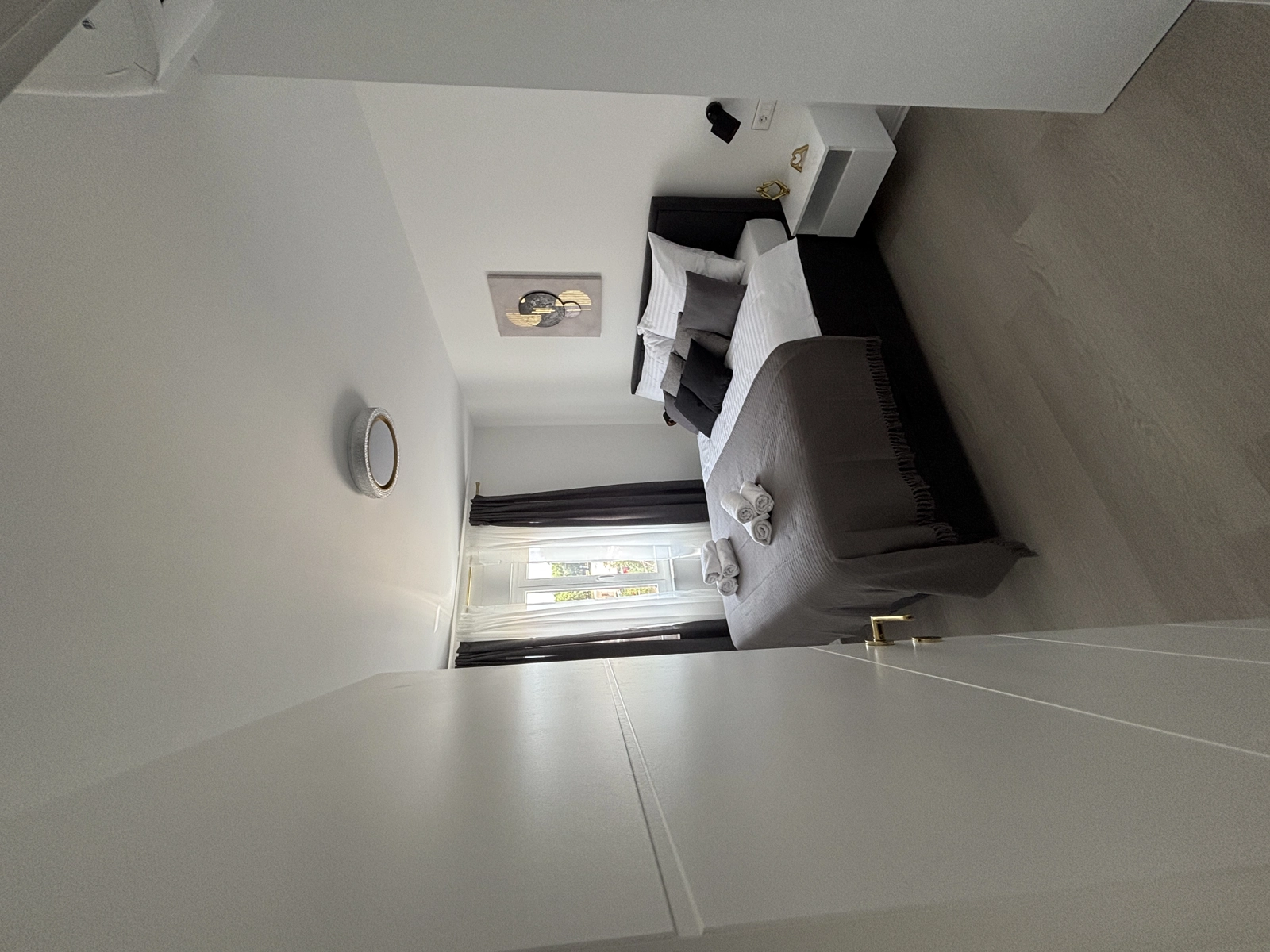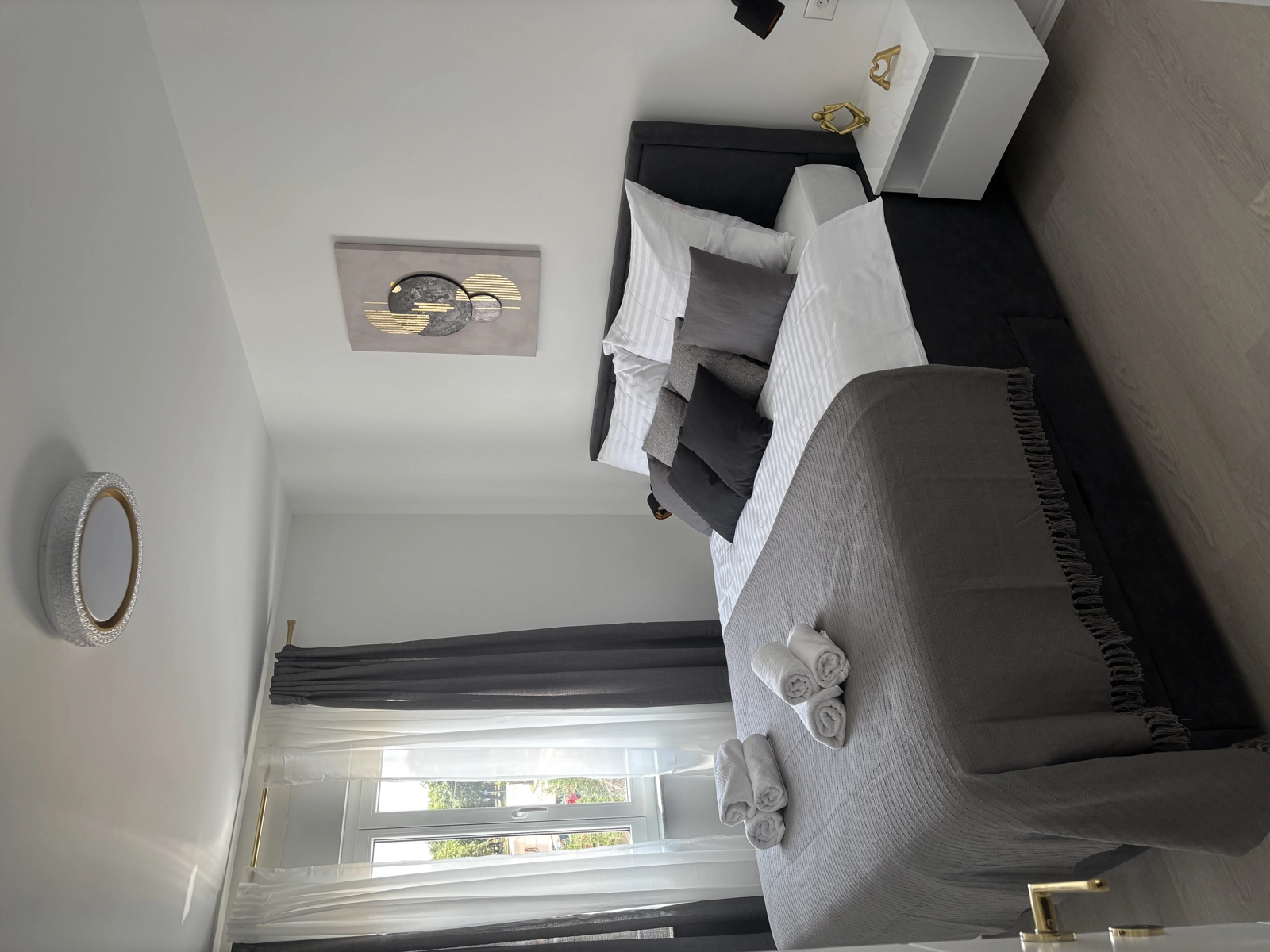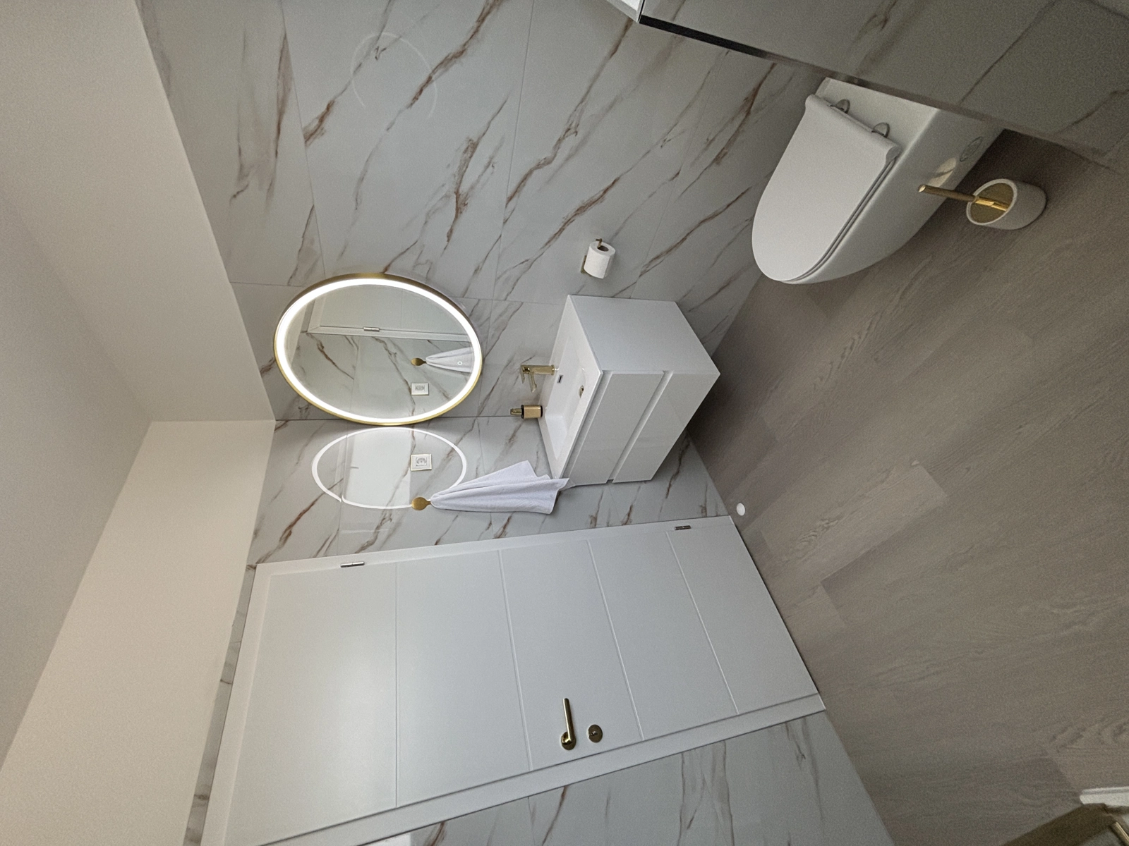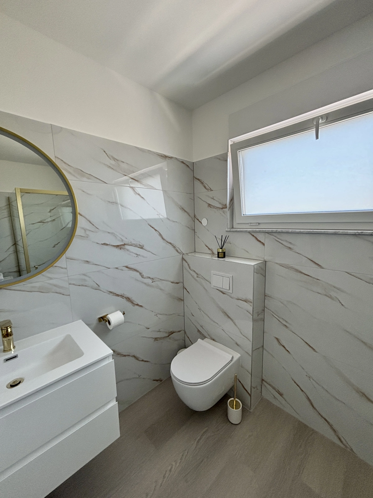 Enjoy a refreshing shower in our elegant bathrooms, featuring gold-finished fixtures, high-quality tiling, and a washing machine for your convenience.
